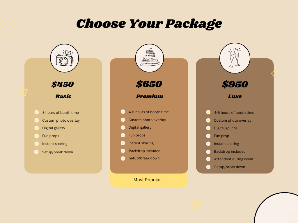 2. Select Your Package: We will communicate with you about packages to see what works best for you. Our packages can include setup, breakdown, an attendant, and full digital delivery.